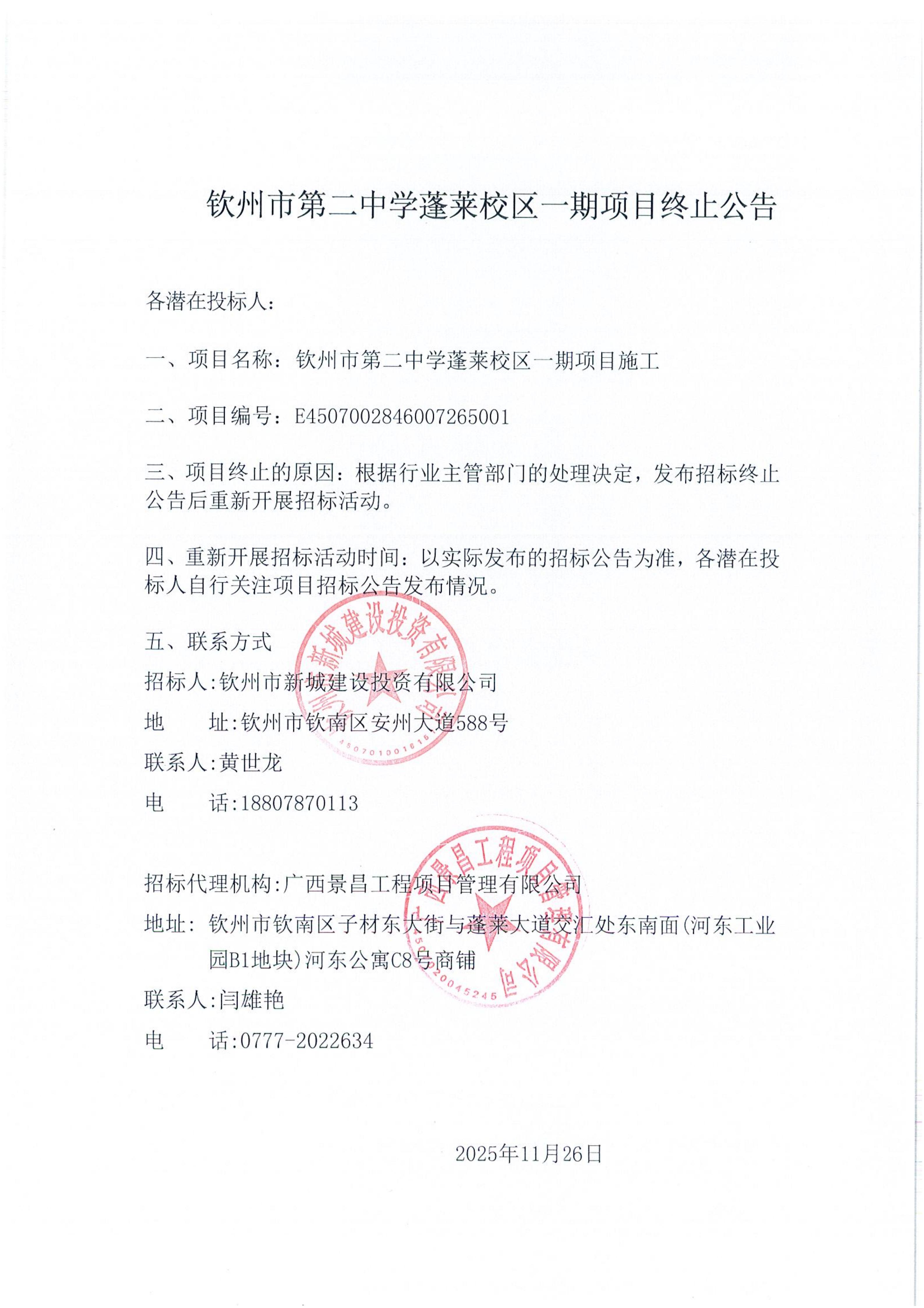 欽州市第二中學(xué)蓬萊校區(qū)一期項(xiàng)目終止公告