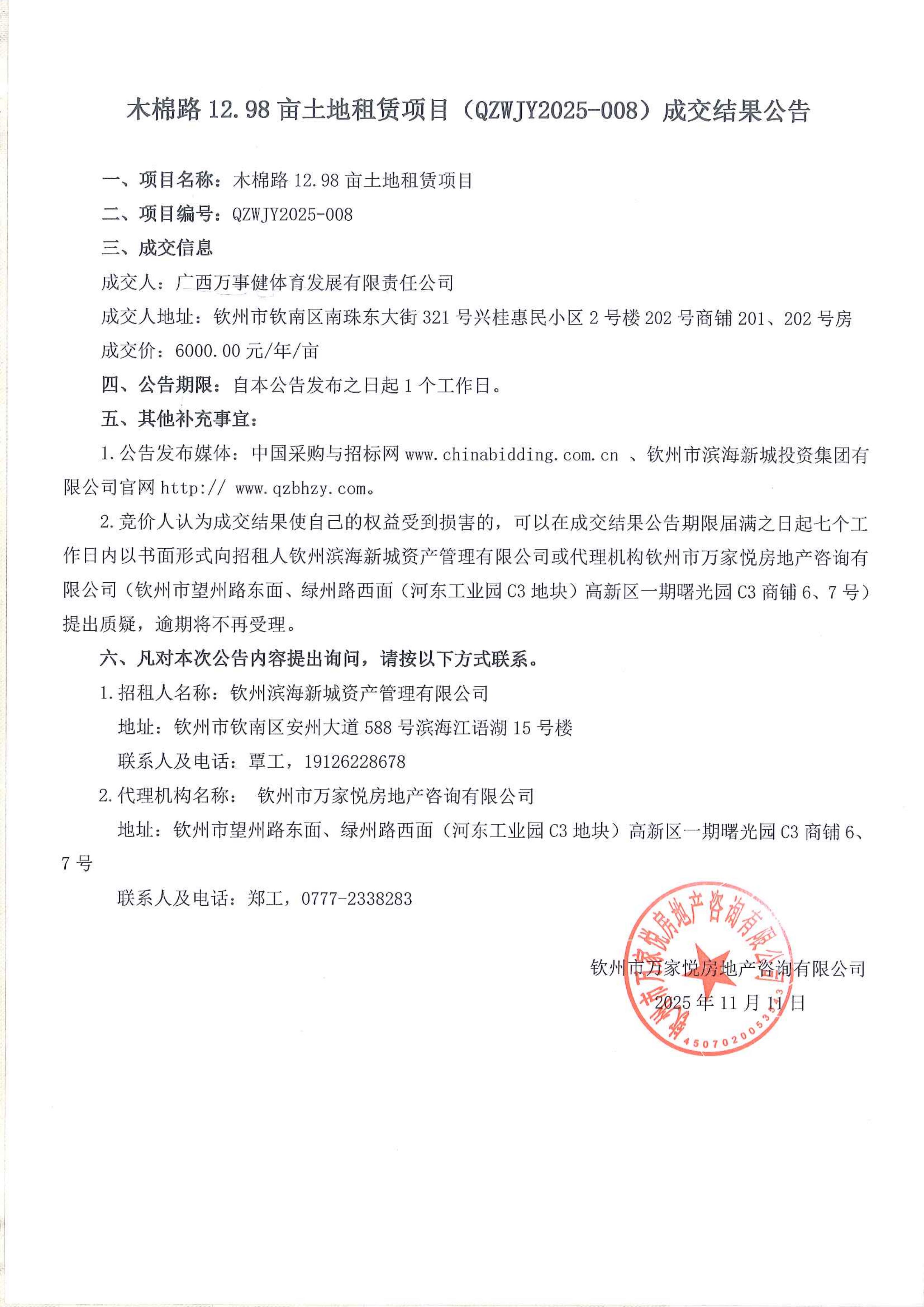 木棉路12.98畝土地租賃項目(QZWJY2025-008)成交結(jié)果公...