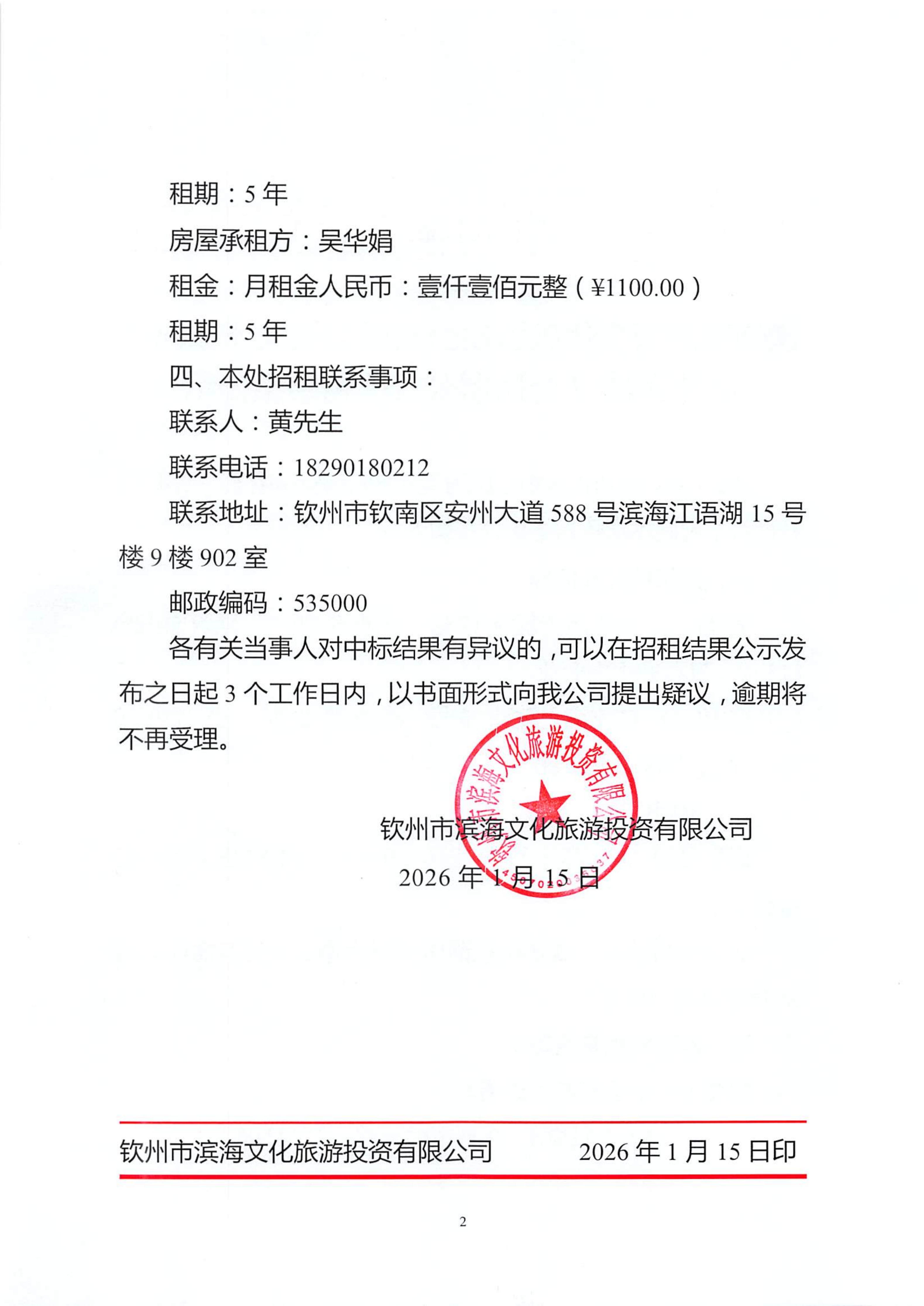 欽州市濱海文化旅游投資有限公司關于欽州市老街范圍2處房屋公開招租結(jié)果公示