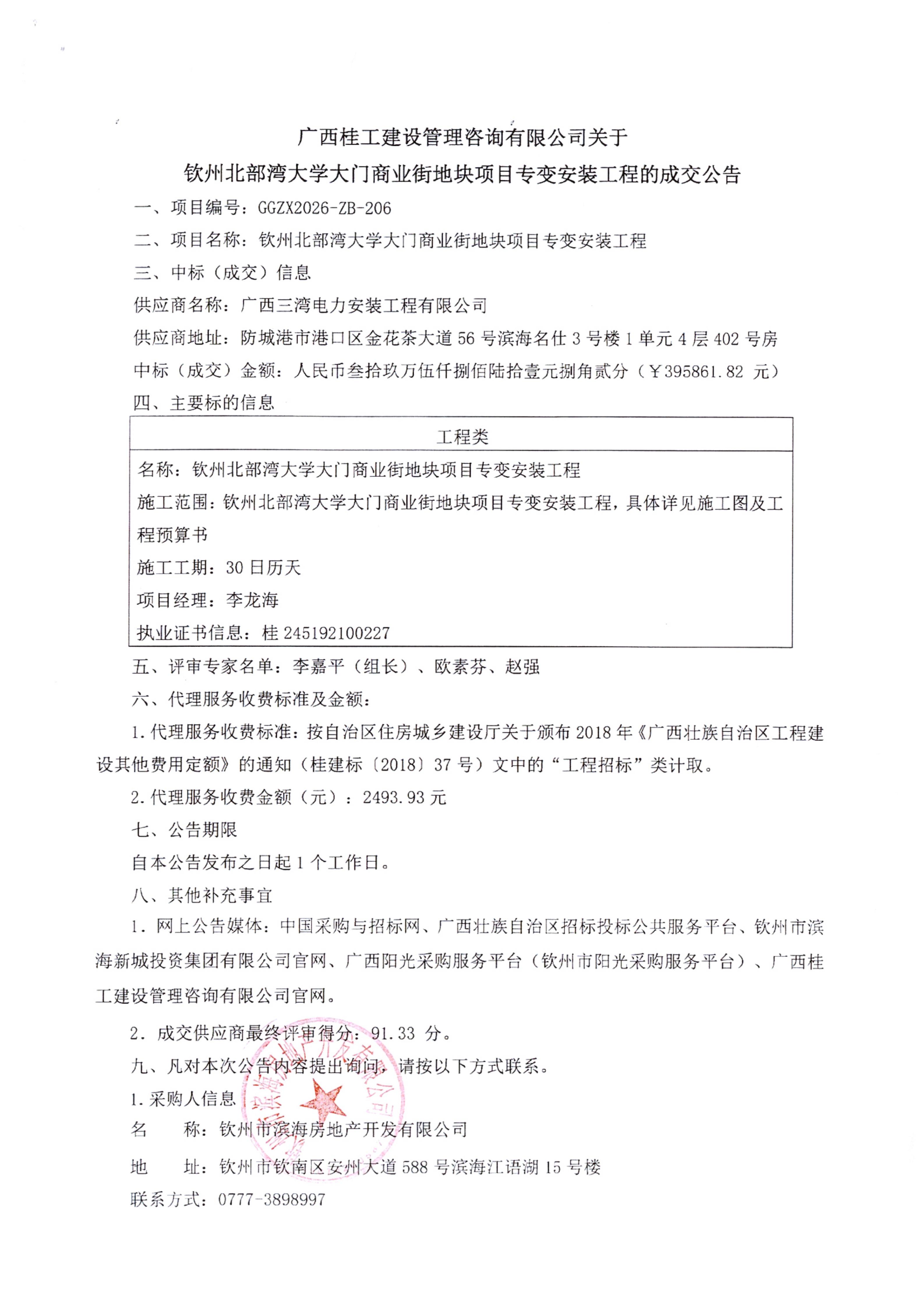 欽州北部灣大學(xué)大門商業(yè)街地塊項(xiàng)目專變安裝工程成交公告
