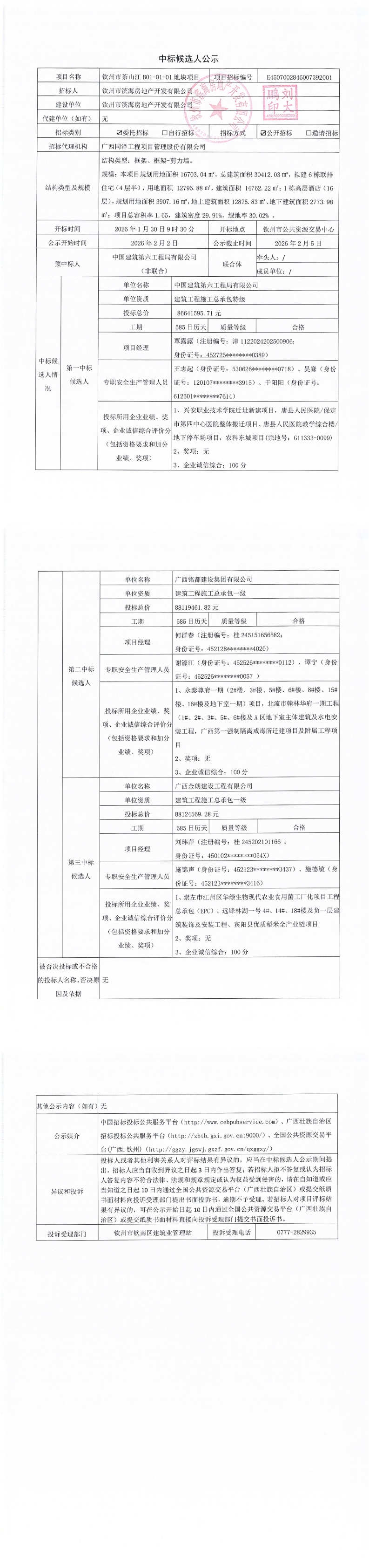 欽州市茶山江B01-01-01地塊項目中標候選人公示