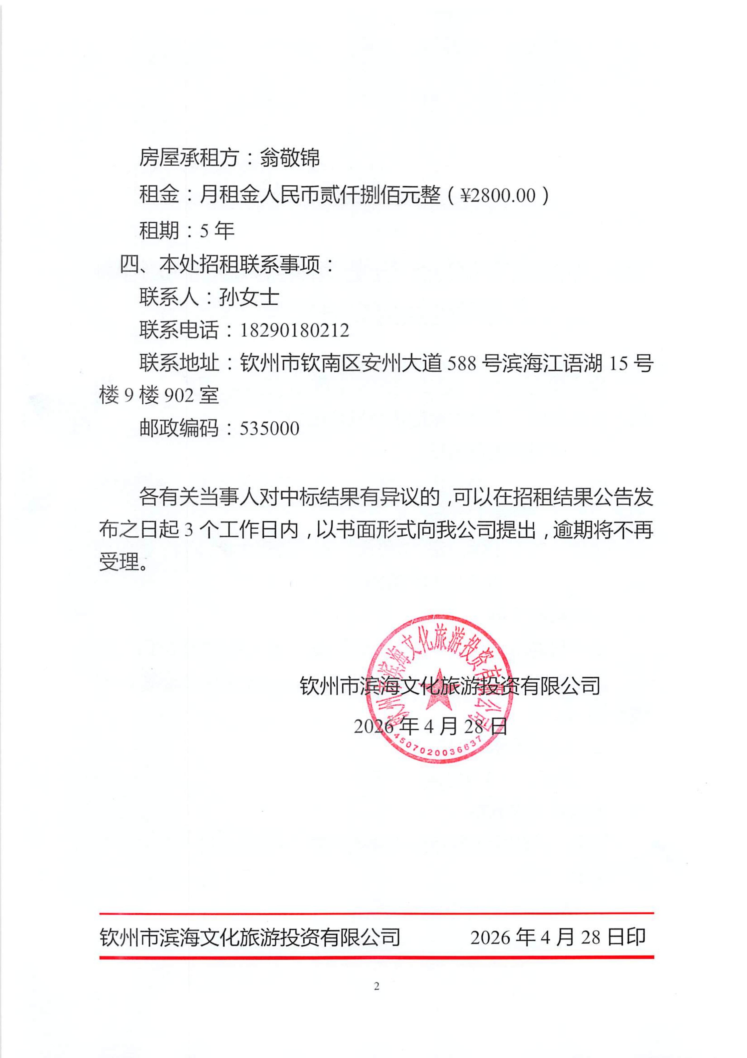 欽州市濱海文化旅游投資有限公司關(guān)于欽州市老街范圍兩處房屋公開招租結(jié)果公示