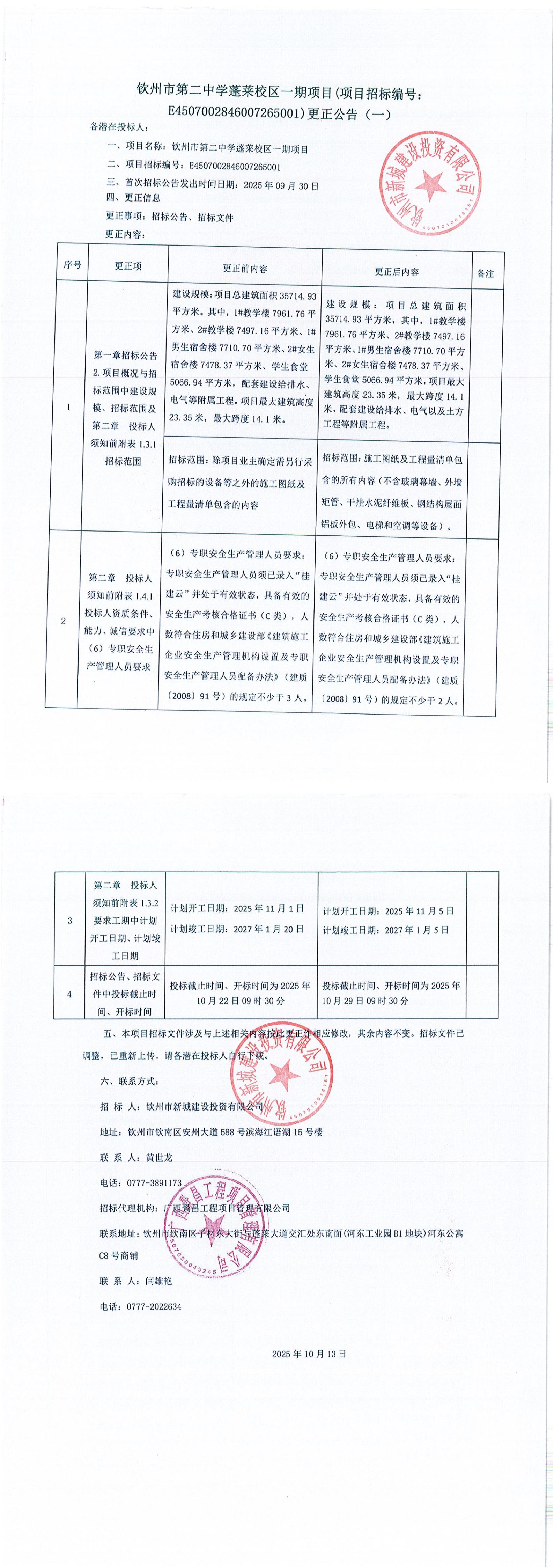 欽州市第二中學(xué)蓬萊校區(qū)一期項(xiàng)目(項(xiàng)目招標(biāo)編號:E4507002846007265001)更正公告(一)