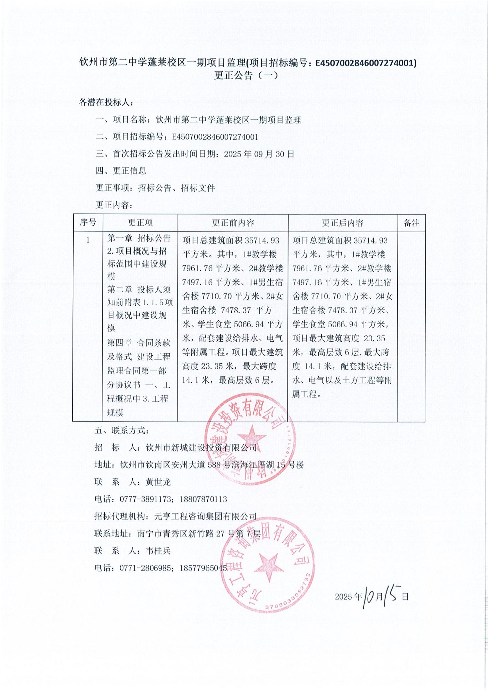 欽州市第二中學(xué)蓬萊校區(qū)一期項(xiàng)目監(jiān)理(項(xiàng)目招標(biāo)編號:E4507002846007274001)更正公告(一)