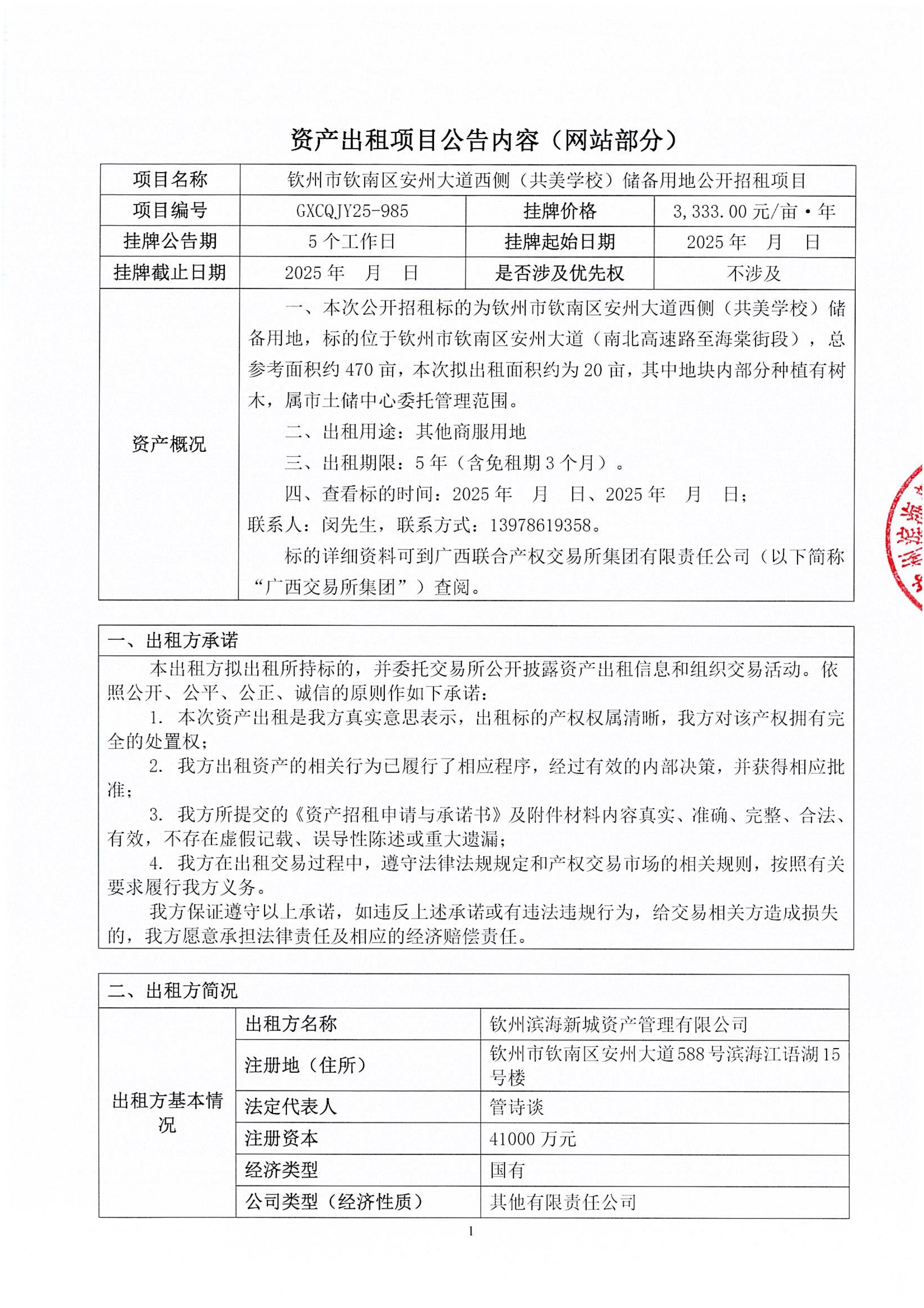 欽州市欽南區(qū)安州大道西側(cè)(共美學(xué)校)儲備用地公開招租項(xiàng)目