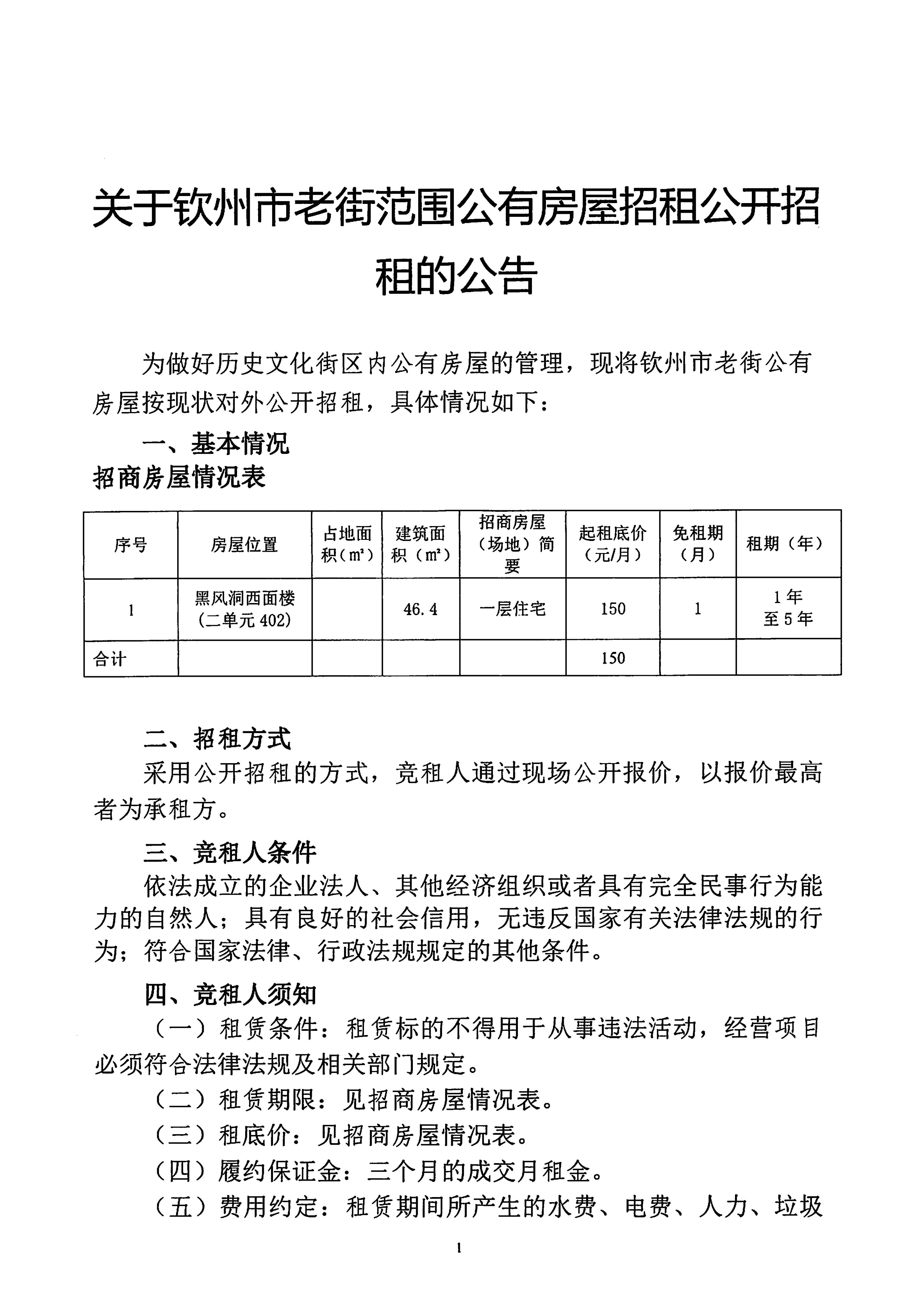 關(guān)于欽州市老街范圍公有房屋招租公開招租的公告(黑風(fēng)洞西面樓二單元402)