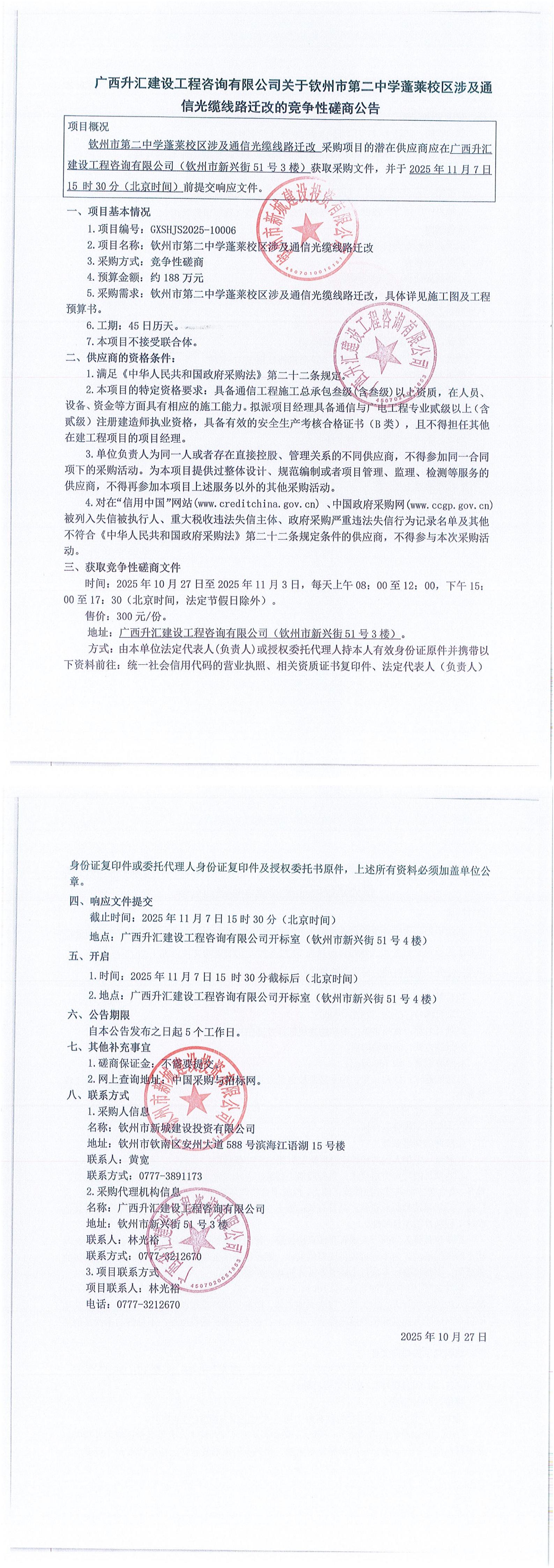 欽州市第二中學(xué)蓬萊校區(qū)涉及通信光纜線路遷改(項(xiàng)目編號: GXSHJS2025-10006)更正公告(二)