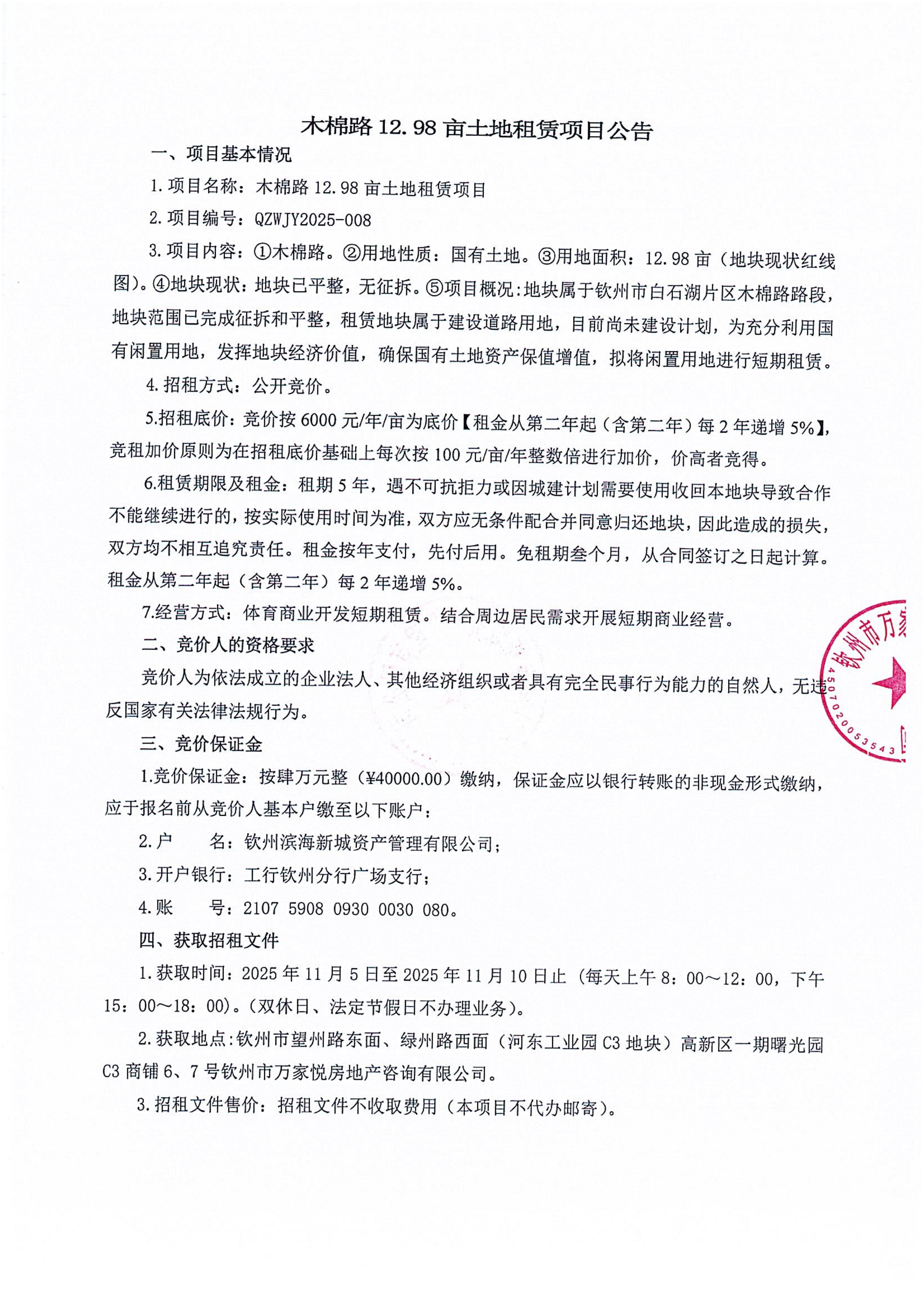 木棉路12.98畝土地租賃項(xiàng)目公告
