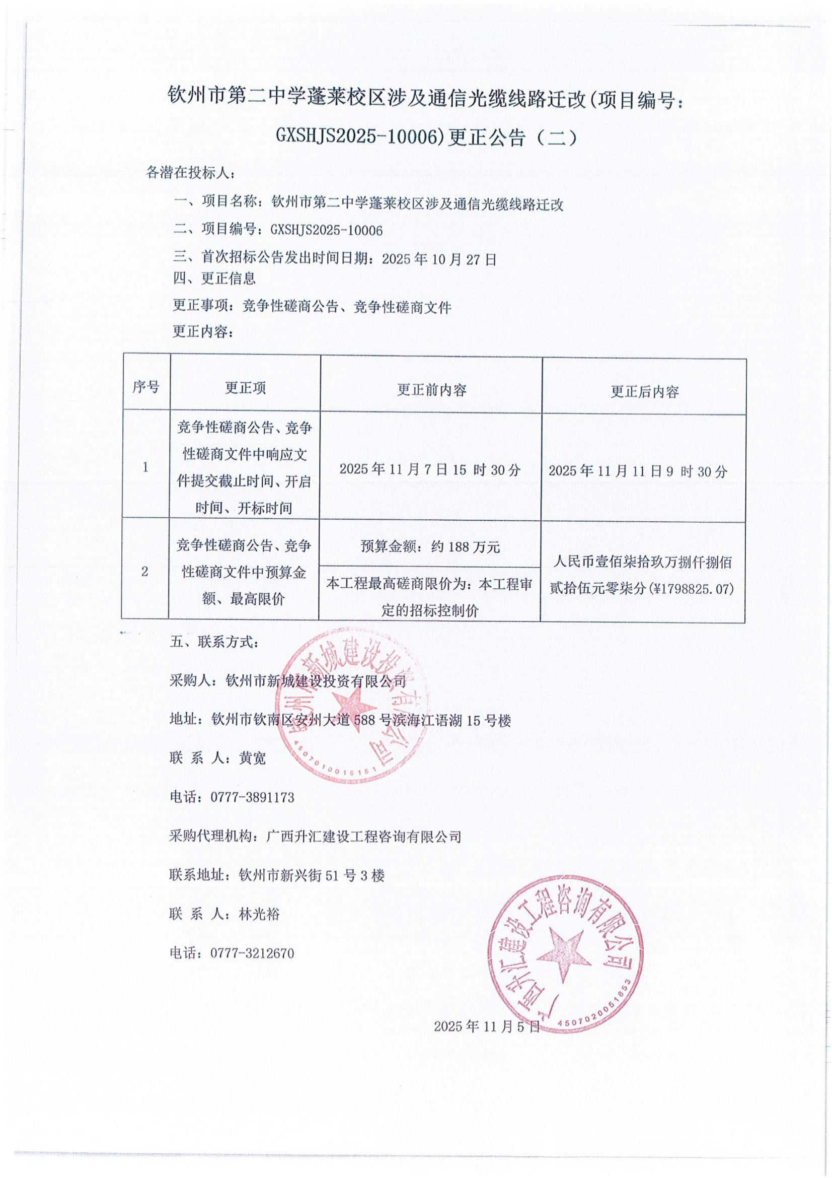 欽州市第二中學(xué)蓬萊校區(qū)涉及通信光纜線路遷改(項(xiàng)目編號: GXSHJS2025-10006)更正公告(一)