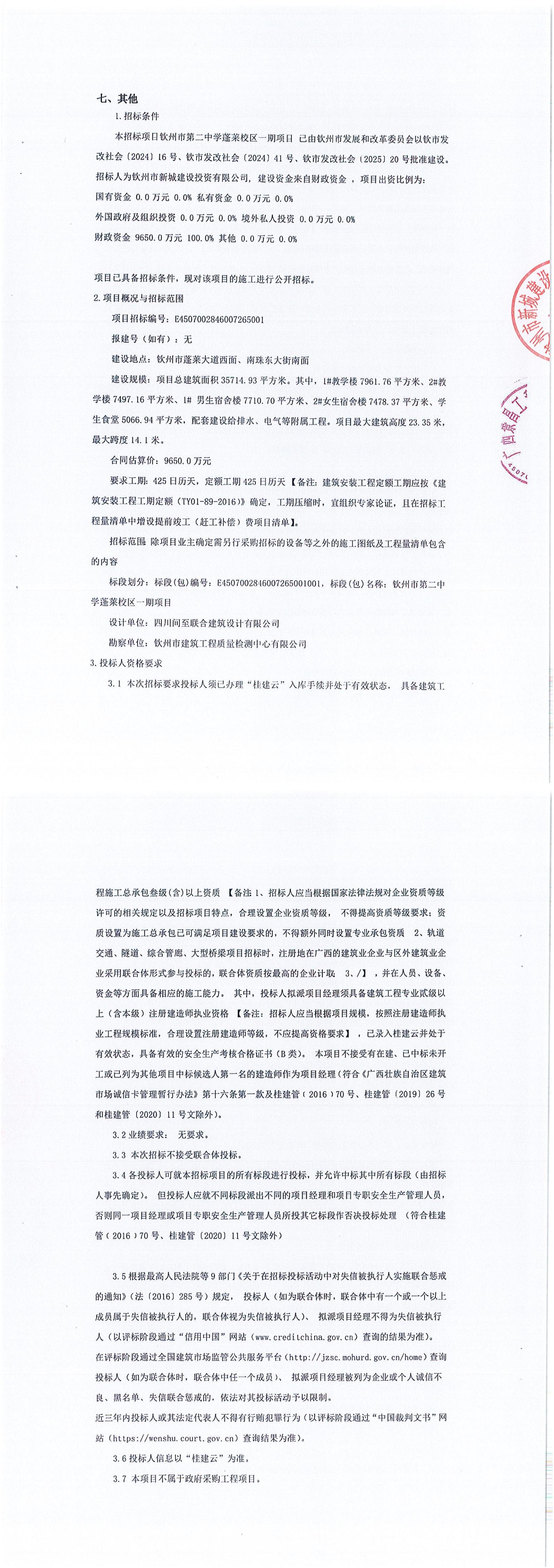 欽州市第二中學(xué)蓬萊校區(qū)一期項目(項目招標編號:E4507002846007265001)更正公告(一)
