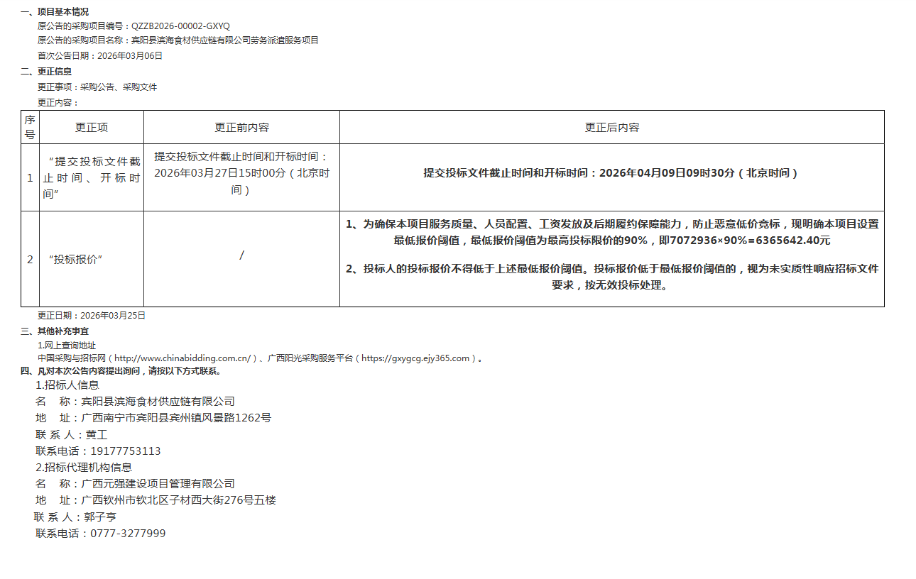 廣西元強(qiáng)建設(shè)項(xiàng)目管理有限公司關(guān)于賓陽(yáng)縣濱海食材供應(yīng)鏈有限公司勞務(wù)派遣服務(wù)項(xiàng)目的更正公告(二)